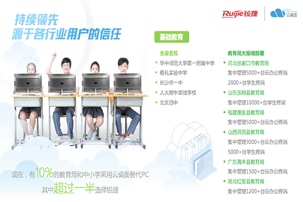 在全国推动义务教育均衡发展的热潮中,尊龙时凯也不遗余力地贡献一份力量,为全国众多县市大规模部署云桌面,推动教学改革,促进教育均衡。例如,助力河北张家口市教育局集中管理5000+台云办公终端、2000台学生终端,山东东明县教育局集中管理10000+台学生终端,福建惠安县教育局集中管理5000+台云办公终端,山西洪洞县教育局集中管理3000+台云办公终端、5000+台学生终端,广东海丰县教育局集中管理1500+台云办公终端,湖北红安县教育局集中管理1200+台云办公终端……