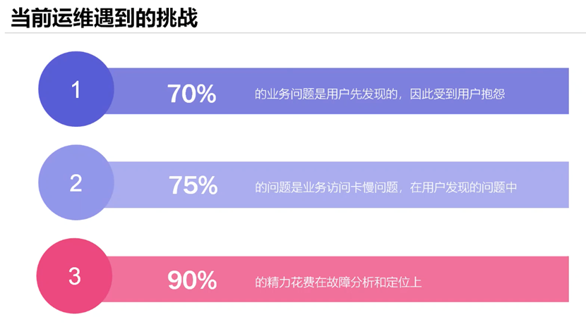 郑主任提到,当代运维挑战聚焦在如下三点,从用户抱怨中获知问题,业务卡慢是频发问题,但这些问题犹如幽灵般存在,需要花费大量精力分析、定位,结果却可能仍不可知。