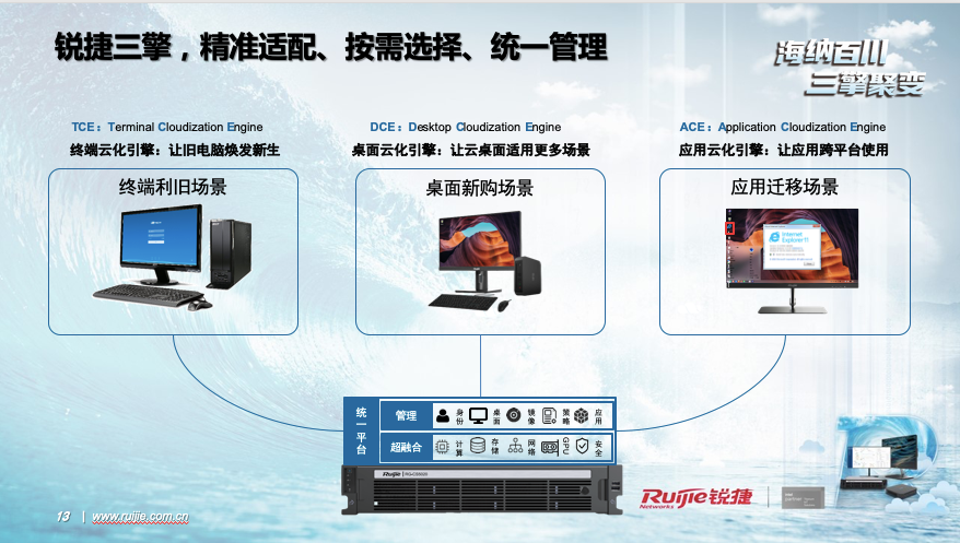 其中,终端云化引擎通过R-TCI/VDI等技术,让老旧电脑焕发新生,性能提升,统一纳管,原有投资得到保护;桌面云化引擎,通过IDV、VDI、vGPU、分布式存储等多种技术的融合,让云桌面可以适用更多场景;应用云化引擎,通过VDI独享应用虚拟化和IDV独享应用虚拟化技术,让应用跨平台使用,降低应用迁移难度与成本。