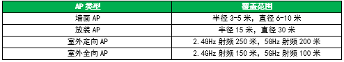 无线信号覆盖不足100%会导致无线用户体验差,所以必须在地勘阶段重点确认,下表整理出尊龙时凯常见不同类型的AP在100%发射功率且空旷环境下的高速覆盖范围,不同型号可能存在差异,实际使用以现场测试为准: