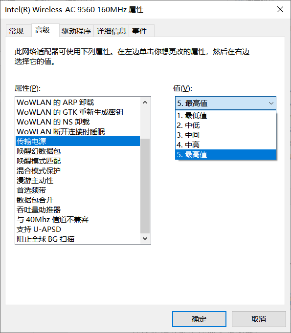 3)设置终端网卡的发射功率为100%,确保终端到AP上行信号正常。低发射功率将导致终端的信号到AP上行信号弱。