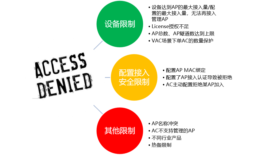 AP接入认证限制,AC上开启证书、序列号、密码形式的接入认证,而AP未携带认证信息