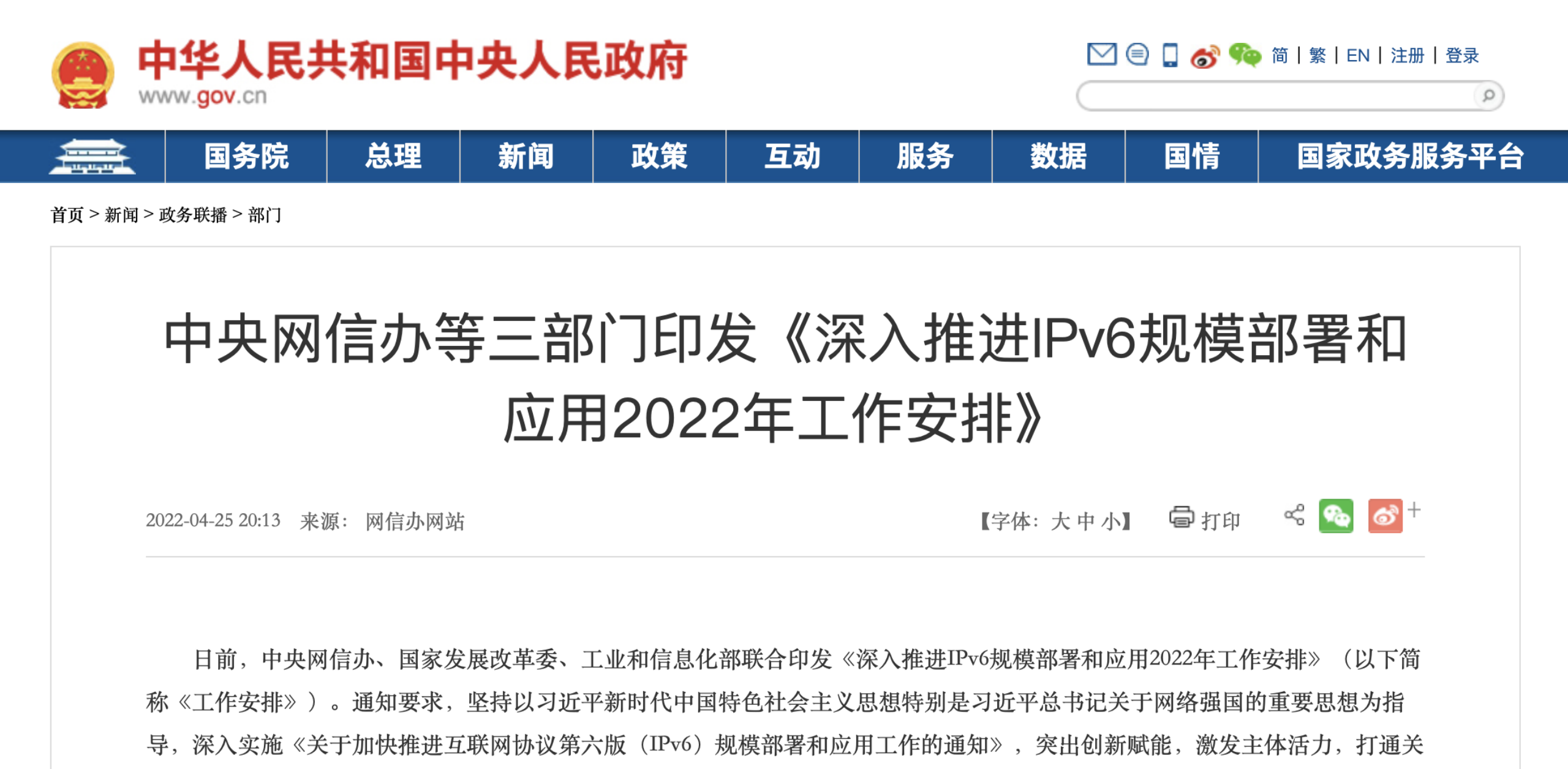 日前,中央网信办、国家发展改革委、工业和信息化部联合印发《深入推进IPv6规模部署和应用2022年工作安排》(以下简称《工作安排》)。