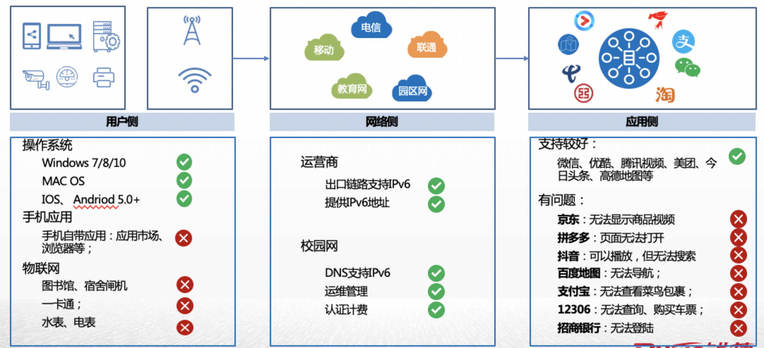 网络侧:整体支持比较好,运营商和校园网目前支持或者有方案支持IPv6;